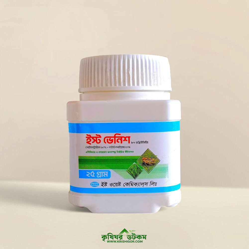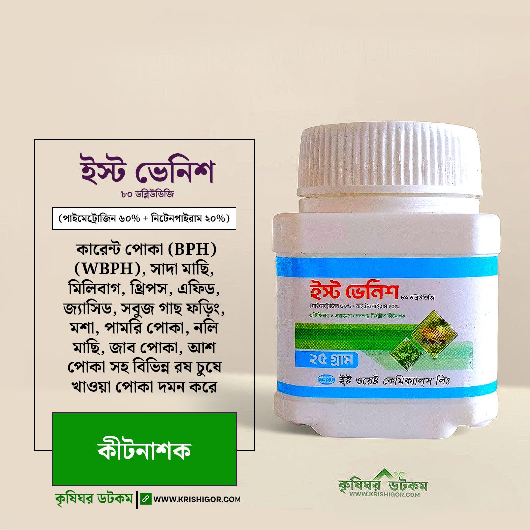 ইস্ট ভেনিশ ৮০ ডব্লিউডিজি হলো একটি শক্তিশালী অন্তর্বাহী, স্পর্শক ও পাকস্থলিজ বিষক্রিয়া গুণসম্পন্ন কীটনাশক। এর প্রধান উপাদান নাইটেনপিরাম (Nitenpyram 60%) ও পাইমেট্রোজিন (Pymetrozine 20%)। এটি ধানের কারেন্ট পোকা (BPH) ও সাদা পিঠওয়ালা কারেন্ট পোকা (WBPH) সহ বিভিন্ন শোষক পোকা দমনে অত্যন্ত কার্যকর। এটি গাছের শিকড় ও পাতার মাধ্যমে অন্তর্বাহীভাবে ছড়িয়ে পড়ে, ফলে গাছের গোড়ায় লুকিয়ে থাকা রষ চুষে খাওয়া পোকাও ধ্বংস হয়। এটি দ্রুত কাজ করে, দীর্ঘস্থায়ী সুরক্ষা দেয় এবং ফসলকে রাখে সবল। এটি কেবল গাছের উপরিভাবে স্প্রে করলে গাছের কাণ্ড ও পাতার মাধ্যমনে শোষিত হয়ে উদ্ভিদের ভিতরে প্রবেশ করে সমস্থ উদ্ভিদের শিরা উপশেরা শেকড় ও কান্ডে পোছে যাই এতে উদ্ভিদের পাতার নিচে ও গোড়ায় লুকিয়ে থাকা পোকাগুলি দমন হয়।