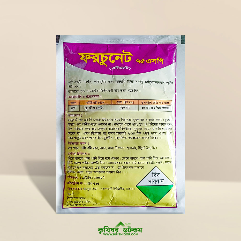 - বহুমাত্রিক পোকা দমন: ফরচুনেট ৭৫ এসপি একই সাথে বিভিন্ন ধরণের শোষক ও পাতা খেকো পোকা দমন করতে পারে, ফলে ফসলের সুরক্ষা নিশ্চিত হয়।