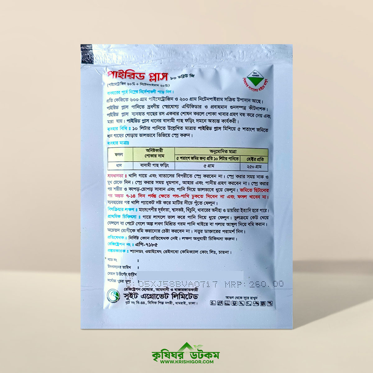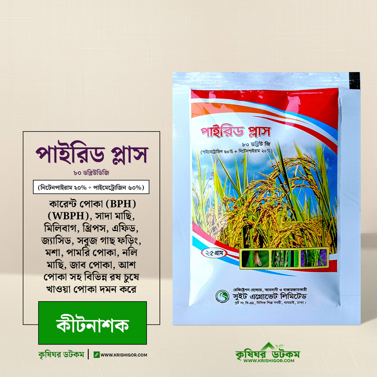 পাইরিড প্লাস ৮০ ডব্লিউজি হলো একটি শক্তিশালী অন্তর্বাহী, স্পর্শক ও পাকস্থলিজ বিষক্রিয়া গুণসম্পন্ন কীটনাশক। এর প্রধান উপাদান আছে প্রতি কেজিতে নিতেনপাইরাম ২০০ গ্রাম ও পাইমেট্রোজিন ৬০০ গ্রাম । এটি ধানের কারেন্ট পোকা (BPH) ও সাদা পিঠওয়ালা কারেন্ট পোকা (WBPH) সহ বিভিন্ন শোষক পোকা দমনে অত্যন্ত কার্যকর। এটি গাছের শিকড় ও পাতার মাধ্যমে অন্তর্বাহীভাবে ছড়িয়ে পড়ে, ফলে গাছের গোড়ায় লুকিয়ে থাকা রষ চুষে খাওয়া পোকাও ধ্বংস হয়। এটি দ্রুত কাজ করে, দীর্ঘস্থায়ী সুরক্ষা দেয় এবং ফসলকে রাখে সবল। এটি কেবল গাছের উপরিভাবে স্প্রে করলে গাছের কাণ্ড ও পাতার মাধ্যমনে শোষিত হয়ে উদ্ভিদের ভিতরে প্রবেশ করে সমস্থ উদ্ভিদের শিরা উপশেরা শেকড় ও কান্ডে পোছে যাই এতে উদ্ভিদের পাতার নিচে ও গোড়ায় লুকিয়ে থাকা পোকাগুলি দমন হয়।